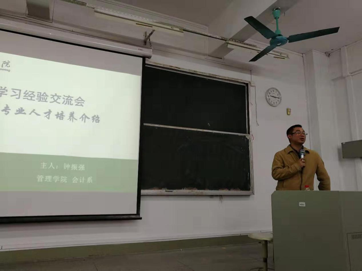 为激发大一学生的学习热情,营造积极向上的学习氛围,会计系学生于2月26日晚在海珠校区教学楼B401召开了会计系学习经验交流会——暨会计专业人才培养规划介绍。出席本次交流会的有管理学院会计系主任钟振强、财务协会副会长伦静娴、会计学专业大三大四各班级优秀代表以及会计学全体大一学生。钟振强为会议开场致辞。