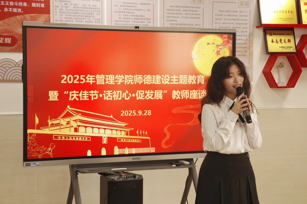 为持续强化教师团队建设,筑牢育人思想根基,9月28日,管理学院在经管楼519会议室举办师德建设主题教育暨“庆佳节·话初心·促发展”教师座谈会。管理学院党委成员、学校工会副主席李汉雄以及教职工代表参加了本次活动,活动由管理学院党委副书记郭肖明主持。