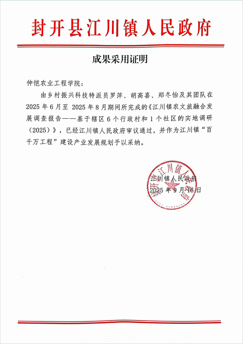 为贯彻落实广东“百县千镇万村高质量发展工程”的工作部署,助力乡村全面振兴与农文旅融合发展,管理学院“菠萝兴农,甜享未来”突击队在科技特派员罗萍、胡高喜和郑冬怡的带领下,于6月26日至7月4日深入肇庆市封开县江川镇开展调研。团队聚焦当地产业优势与特色景观,覆盖辖区6个行政村及1个社区,撰写了《江川镇农文旅融合发展调查报告--基于辖区6个行政村和1个社区的实地调研(2025)》,该调研报告获江川镇人民政府审议通过,并作为江川镇“百千万工程”建设产业发展规划予以采纳。