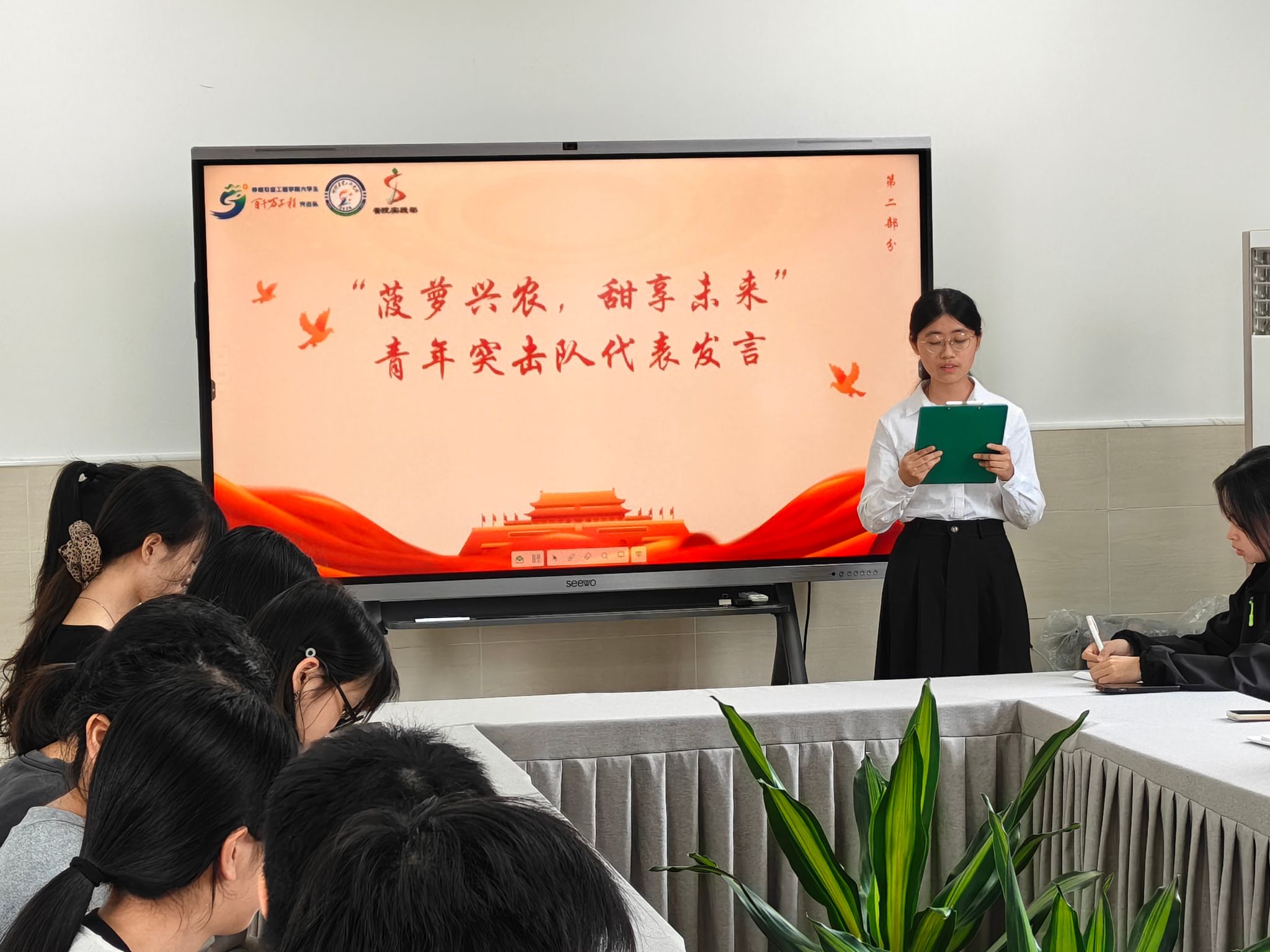 “白沙兴,仲有爱”青年突击队代表徐培媛在会议上总结队伍实绩,以多元行动为地方发展注入青春动能;在建党节走访“光荣在党50年”老党员,传承红色精神;直播带货白沙绿茶冲榜抖音茶榜第二、2小时销售额突破2000元;绘制特色地图、制作出了一系列文创:同时开展推普宣传与资助政策讲解活动,助力民生服务。
