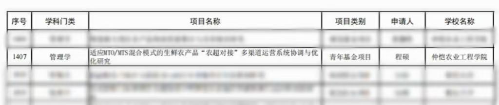 近日,教育部社科司正式公示2025年度人文社会科学研究一般项目评审结果,我院程硕副教授牵头申报的《适应MTO/MTS混合模式的生鲜农产品“农超对接”多渠道运营系统协调与优化研究》获得青年基金项目立项。