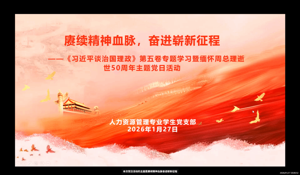 精神血脉赓续不绝,时代征程催人奋进。为深入学习领会《习近平谈治国理政》第五卷的核心要义与实践要求,深切缅怀周恩来同志的崇高风范与不朽功绩,引导学生党员传承红色基因、筑牢信仰之基,强化使命担当、凝聚奋进力量,管理学院人力资源管理专业学生党支部于2026年1月27日开展“赓续精神血脉,奋进崭新征程——《习近平谈治国理政》第五卷专题学习暨缅怀周总理逝世50周年”主题党日活动,支部党员与发展对象参加。