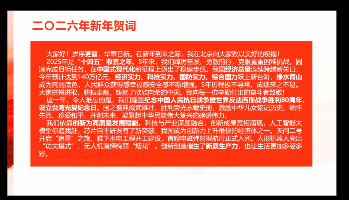 会议伊始,支部落实第一议题,学习习近平总书记二〇二六年新年贺词。通过对第一议题的学习,全体党员深受鼓舞、倍感振奋,深刻领悟到贺词中蕴含的思想伟力与实践要求,并深刻认识到,要自觉把思想和行动统一到习近平总书记的殷切嘱托上来,深刻把握 “十四五” 收官的辉煌成就与 “十五五” 开局的战略机遇,深刻理解创新驱动、民生为本、国家统一、自我革命的时代内涵,将贺词精神转化为砥砺前行的坚定信念和干事创业的实际行动。要强化使命担当、勇于实干争先,把个人成长融入中国式现代化建设的壮阔征程,在科技创新、基层治理、民生服务等领域主动作为,以青年党员的朝气与锐气,为续写中国奇迹、实现民族复兴伟业注入源源不断的青春力量。