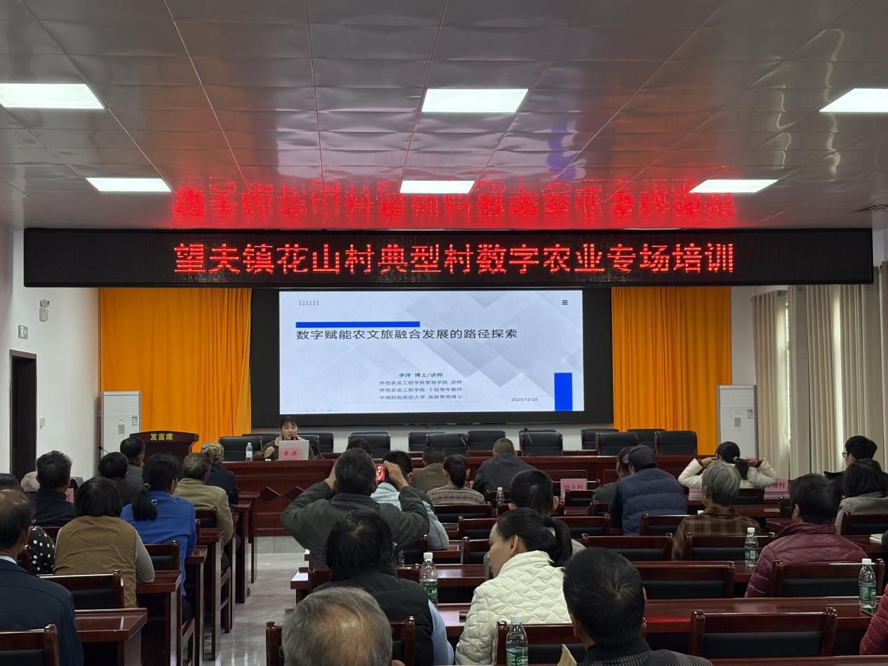 管理学院罗雯主任从农产品品牌定位这一根本问题切入,系统讲解了市场细分、目标市场选择与定位理论,并结合案例深入分析了农业品牌在新媒体电商环境下的营销优化路径,为农业小微企业对自身资源优劣势的梳理,以及如何提升市场竞争力提供了理论指导。李洋博士为望夫镇干部农户解析数字赋能农文旅融合路径。讲座紧扣国家"十五五"规划与省"百千万工程"政策,紧密围绕望夫镇"生态+产业+文化"资源禀赋,通过国内农文旅成熟发展案例介绍,详解AR/VR沉浸式体验、直播经济、区块链溯源等实操模式,为望夫镇低成本数字化转型提供可参考的经验和方案。