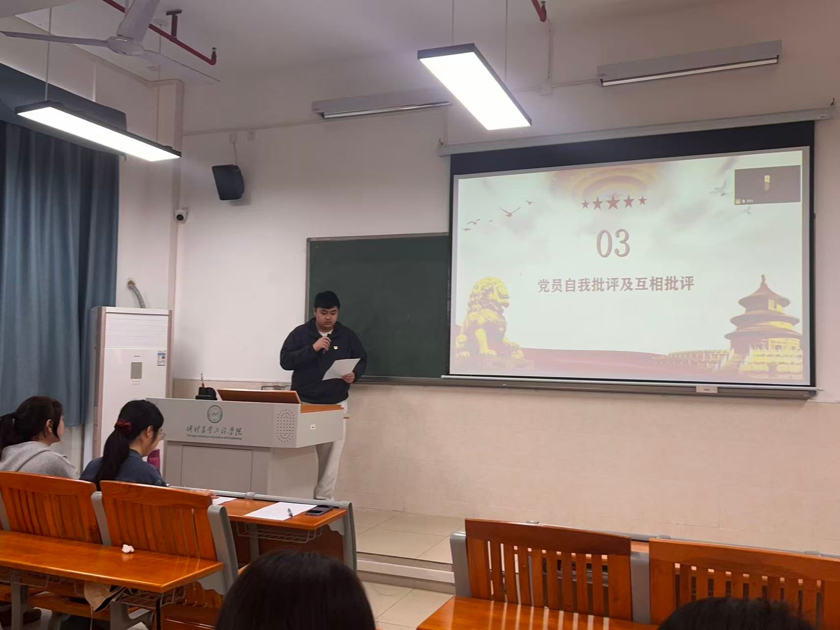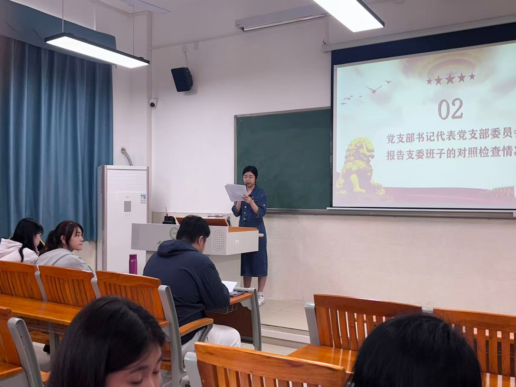 在第二项议程中,陈舒恬代表党支部委员会报告了支委班子2025年度对照检查情况。报告围绕理论学习、政治素养、能力本领、担当作为、工作作风、廉洁自律等六个方面,全面总结了支部在落实“三会一课”、加强党员教育管理、推动党建与业务融合等方面取得的主要成效。同时,坚持问题导向,深刻查摆了班子在理论学习的深度与转化、攻坚克难的担当精神、服务师生的宗旨意识、工作作风的严谨细致以及廉洁自律的学用结合等方面存在的不足,并提出了具体的整改措施和努力方向。