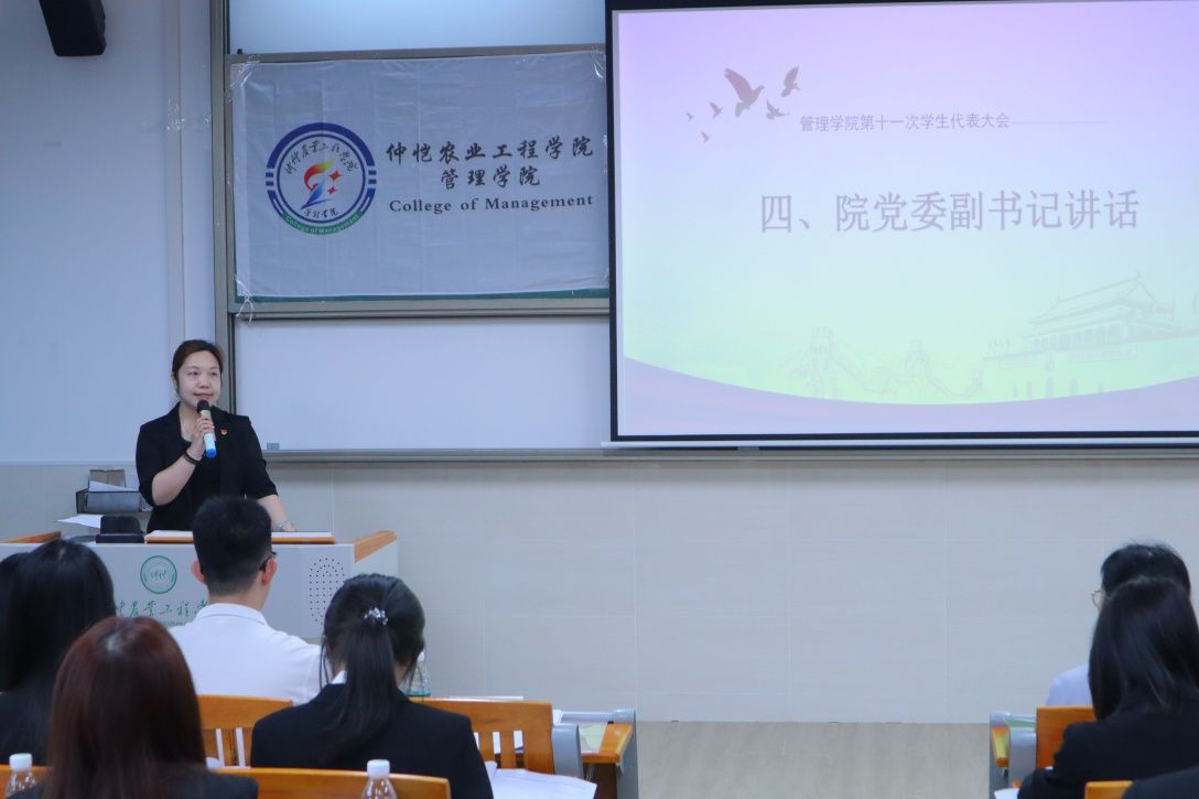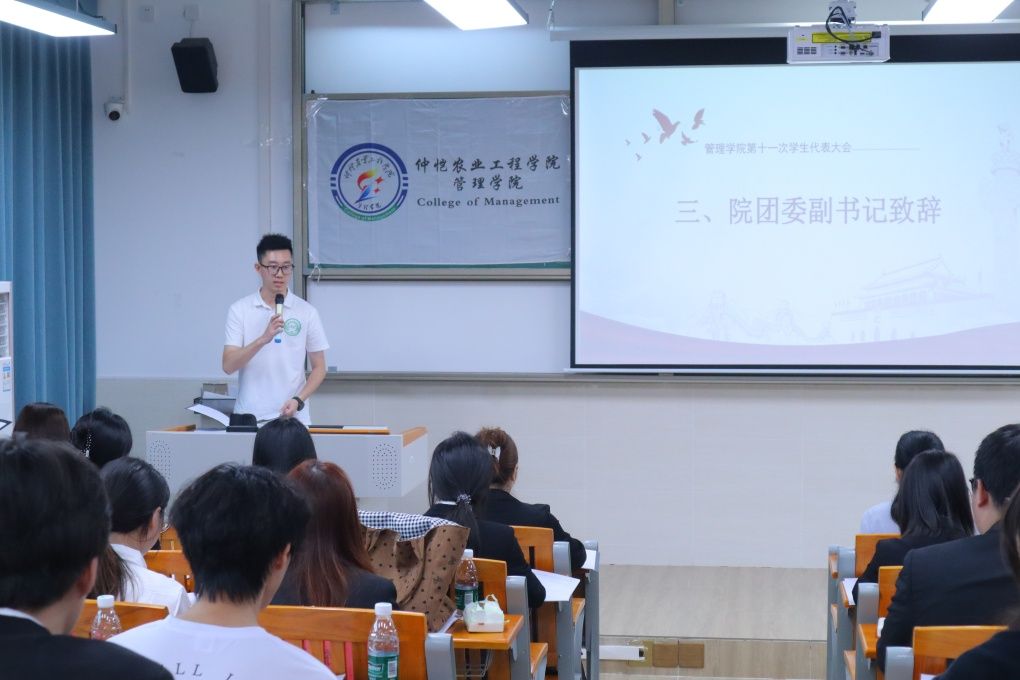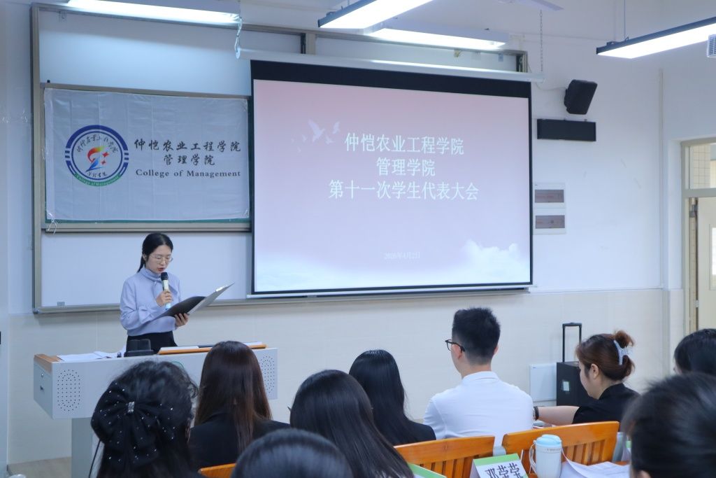 2026年4月2日,仲恺农业工程学院管理学院第十一次学生代表大会在白云校区德新楼一楼报告厅顺利召开。学院党委副书记郭肖明、团委副书记荆昊昊、学生会指导老师廖静贻,23、24级辅导员陈琛及42名正式学生代表出席大会,共商学生会发展大计,凝聚青春奋进力量。