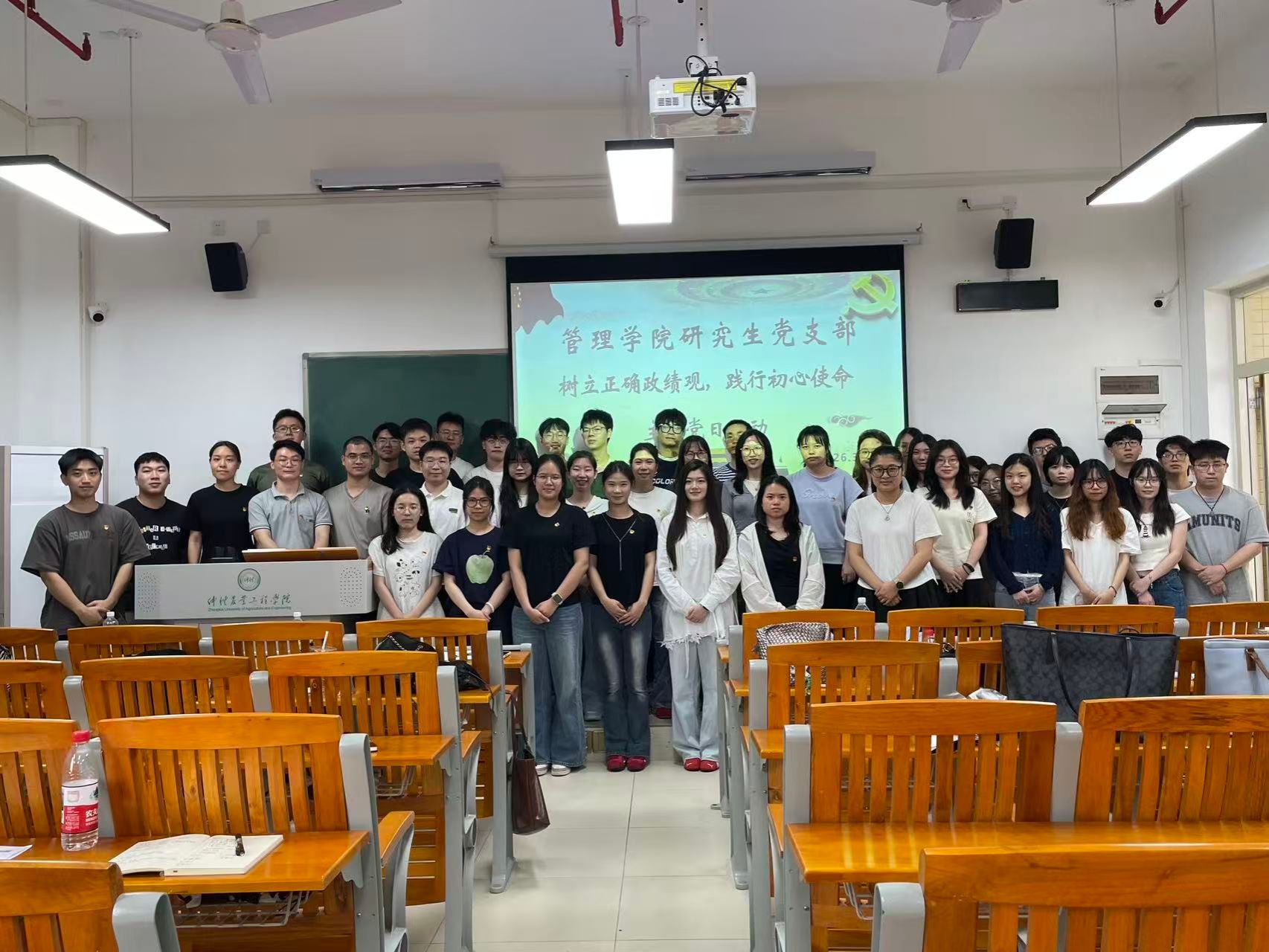 践行初心使命——管理学院研究生党支部开展主题党日活动为教育引导支部党员树立和践行正确政绩观,筑牢思想根基,强化使命担当,3月29日,管理学院研究生党支部在白云校区开展“树立正确政绩观 践行初心使命”主题党日活动。研究生党支部全体党员及入党积极分子参与了本次活动。活动伊始,吴梅同志领学第一议题,学习习近平总书记关于树立和践行正确政绩观的重要论述,通过理解树立和践行正确政绩观的价值取向和重要标准,让全体党员深刻领会到要以立党为公、为民造福、科学决策、真抓实干为导向,切实筑牢思想理论根基,为推动“十五五”开好局起好步贡献力量。在微党课学习环节,朱用香同志围绕“为何重提政绩观”“十六字总要求核心要义”(即‘立党为公、为民造福、科学决策、真抓实干’)等内容展开,通过自身驻村书记的具体实践,深入阐释政绩观作为党员干部从政谋事总开关的重要意义,引导支部党员辩证把握党性与人民性的内在统一,坚持实事求是,以实干担当创造经得起检验的实绩.