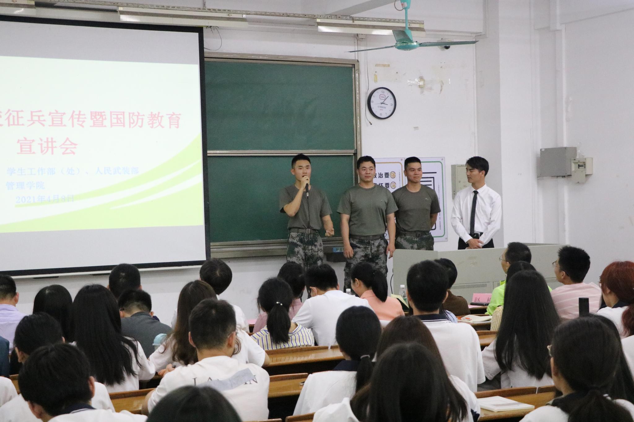 为积极响应国家号召,有效开展2021年学校征兵入伍宣传工作,由党委学生工作部(处)、人民武装部主办,管理学院承办的2021年学校征兵宣传暨国防教育宣讲会于4月8日下午在海珠校区教学楼B301室举行。党委学生工作部、人民武装部部长李伟东,副部长昌灯圣,管理学院党总支书记柯锦泉,海珠校区各学院党总支副书记出席了本次会议。