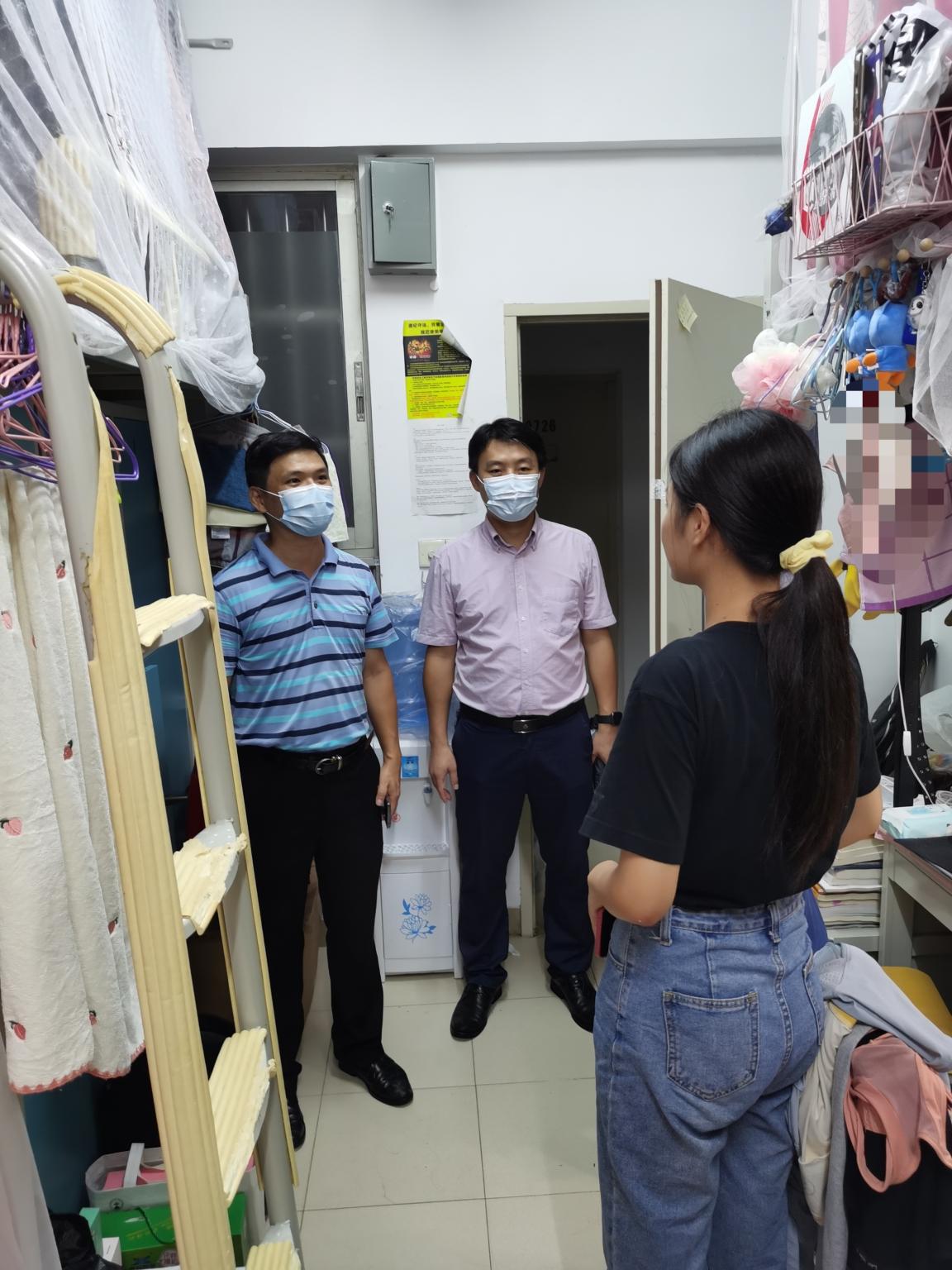 在走访过程中,柯锦泉、梁其才与同学们亲切交流,详细询问了同学们学业进展、就业方向、未来规划等方面的情况,特别叮嘱同学们要严格按照学校要求继续做好疫情防控工作,遵守社区管理规定,注意消防安全、用电安全,在新学期养成良好生活习惯,齐心协力建设文明宿舍,共同构建和谐学生社区。