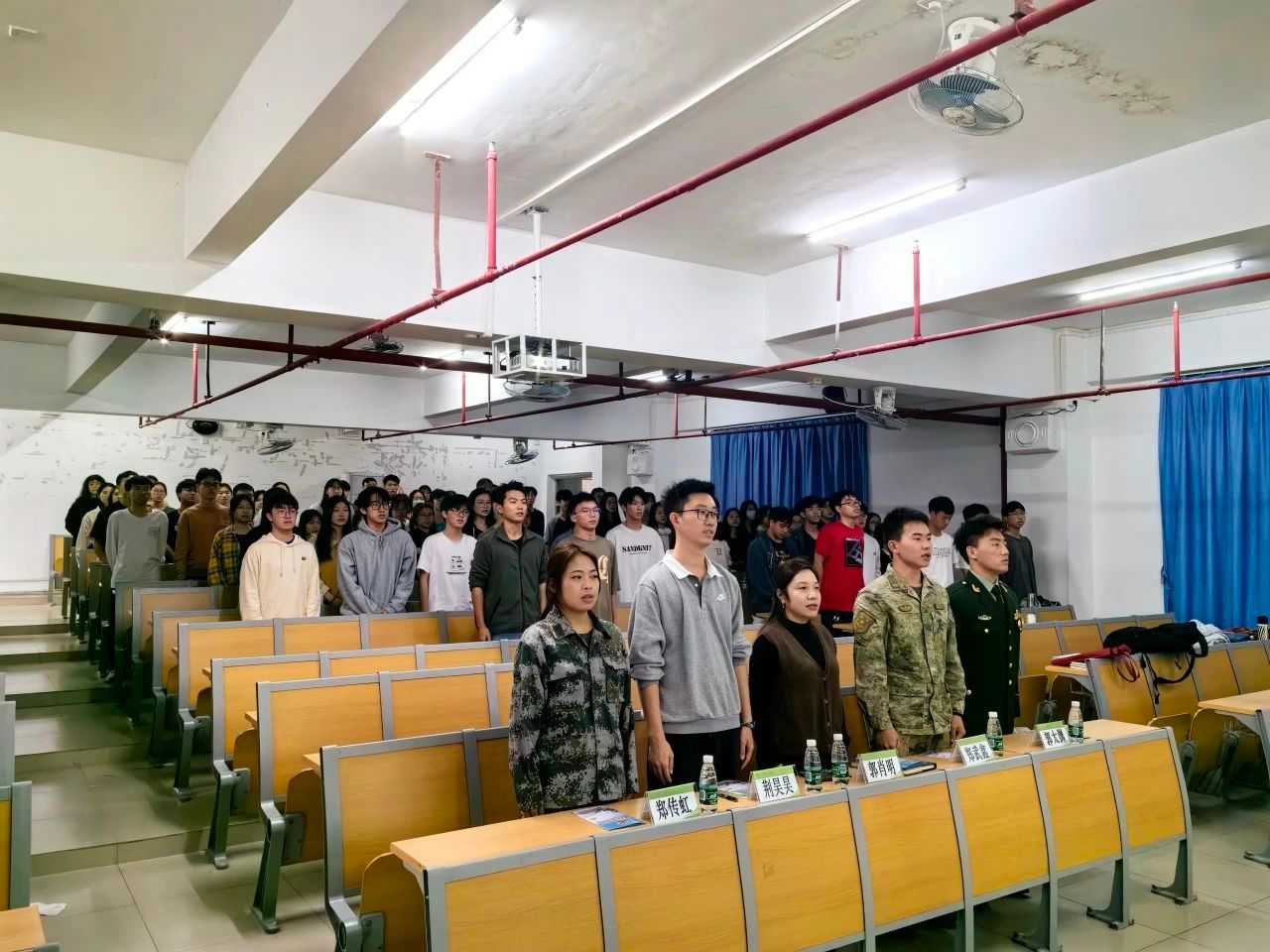 大会第一项议程,全体肃然起敬,奏唱国歌,“起来,不愿做奴隶的人们……”。伴随着庄严肃穆的国歌,会议进入第二项议程,由三名退伍的同学向我们分享他们两年的军旅生涯。