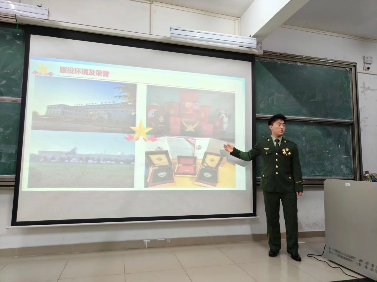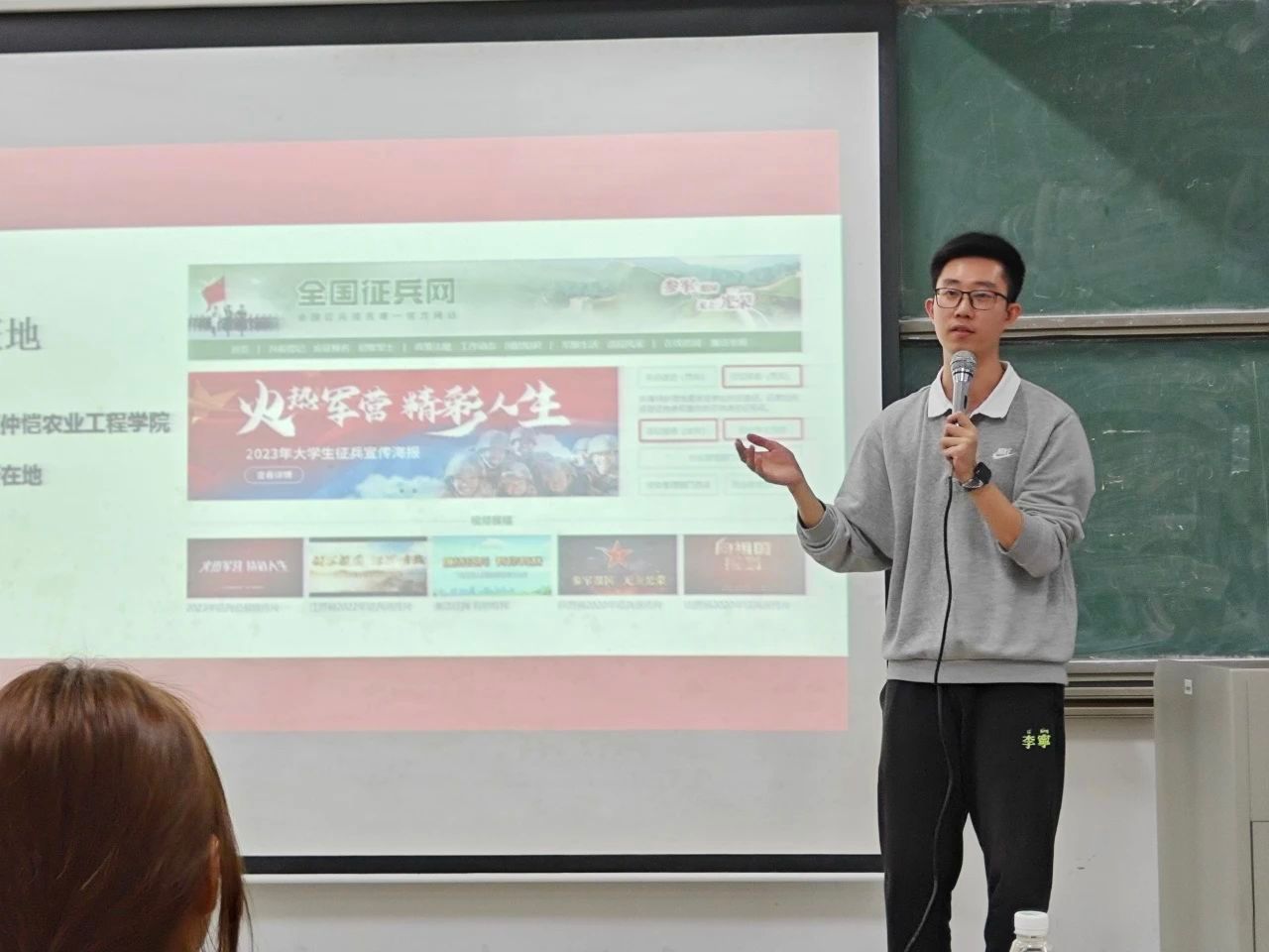 大会第三项议程,荆昊昊辅导员向我们详细地讲解入伍的条件,政策和福利。他提到:“军营里的生活就像是军事化的大学,军营里的娱乐活动不比大学少。”最后,他向我们展示了今年9月份管院学子入伍的照片,一幕幕父母为孩子自豪的画面,一幕幕离别不舍的场景触动了在场的很多人,就如身临其境一般。
