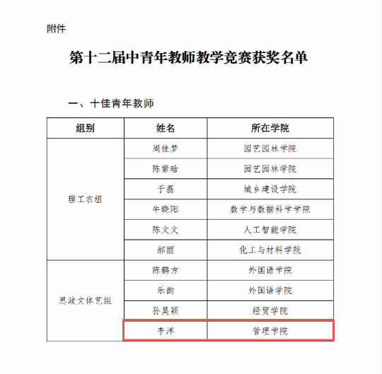 近日,学校发布了第十二届青年教师教学竞赛的获奖结果,我院教师李洋凭借卓越的教学实力与专业素养,荣膺“十佳青年教师”称号。这一荣誉不仅是对李洋老师个人教学能力的高度肯定,更是管理学院师资队伍建设成果的生动体现。