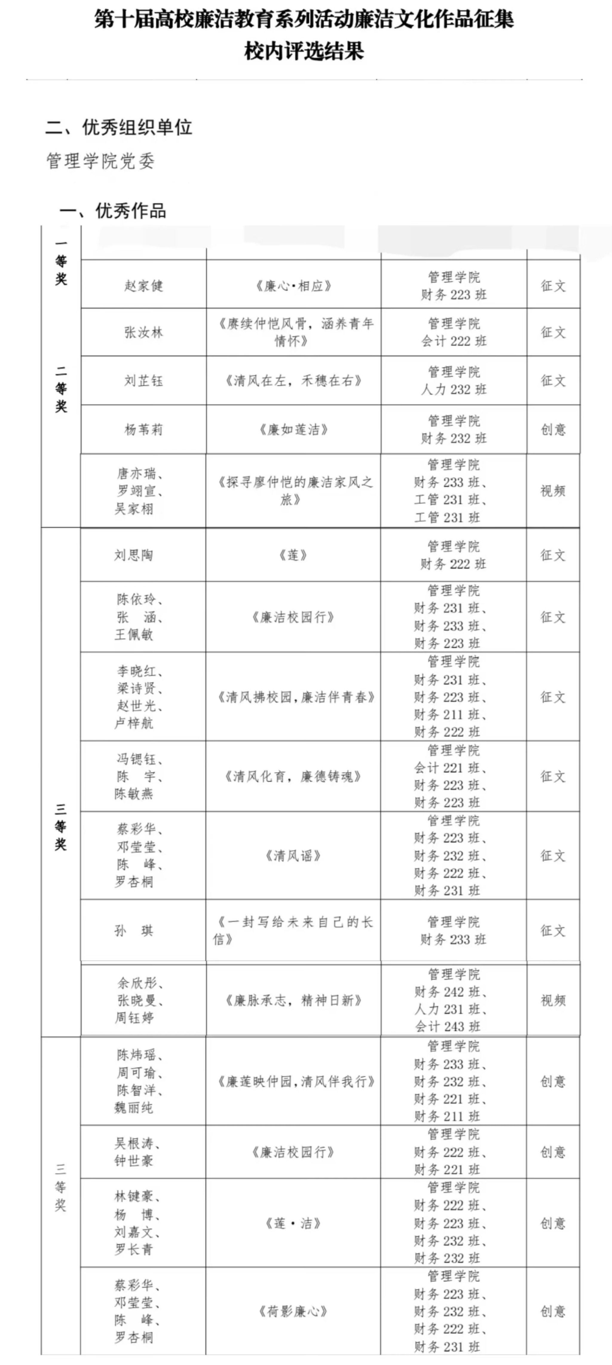 近日,管理学院党委在第十届高校廉洁教育系列活动廉洁文化作品征集中获得“优秀组织单位”,赵家健等管院学子在该活动中成绩斐然,获得多项奖项,特此报喜!