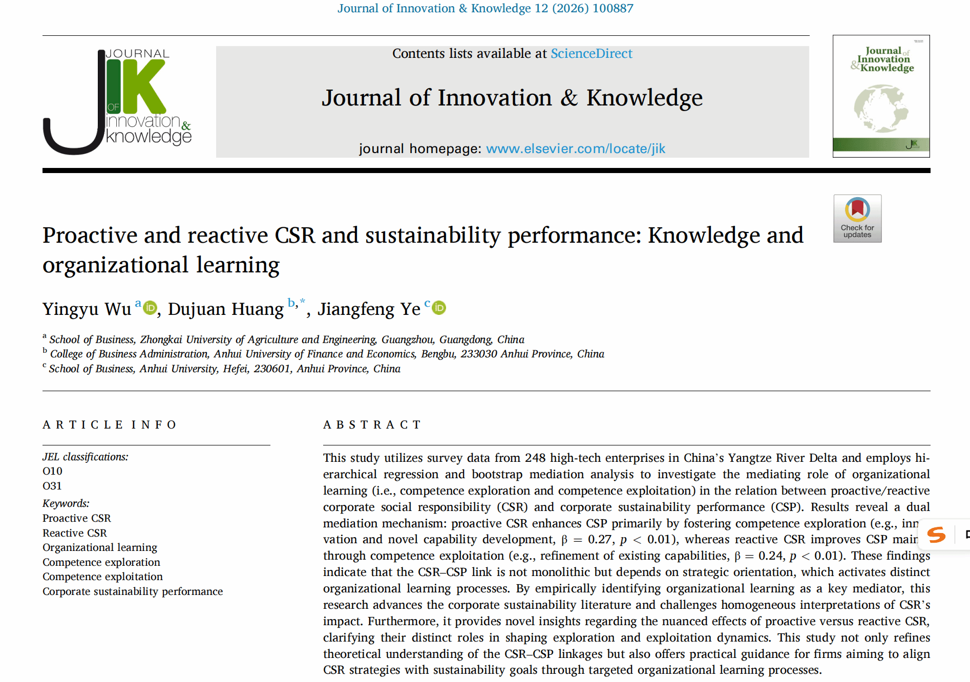近期,我校管理学院吴映玉老师(第一作者)与安徽财经大学工商管理学院黄杜鹃教授(通讯作者)、安徽大学商学院叶江峰教授在企业社会责任与可持续发展研究中取得重要进展,合作完成的学术论文 “Proactive and reactive CSR and sustainability performance: Knowledge and organizational learning” 在国际顶级期刊《Journal of Innovation & Knowledge》正式发表。《Journal of Innovation & Knowledge》是创新与知识管理领域的国际权威期刊,位列 JCR Q1、中科院管理学一区,2024年影响因子达 15.5,在全球相关研究领域具有重要学术影响力。