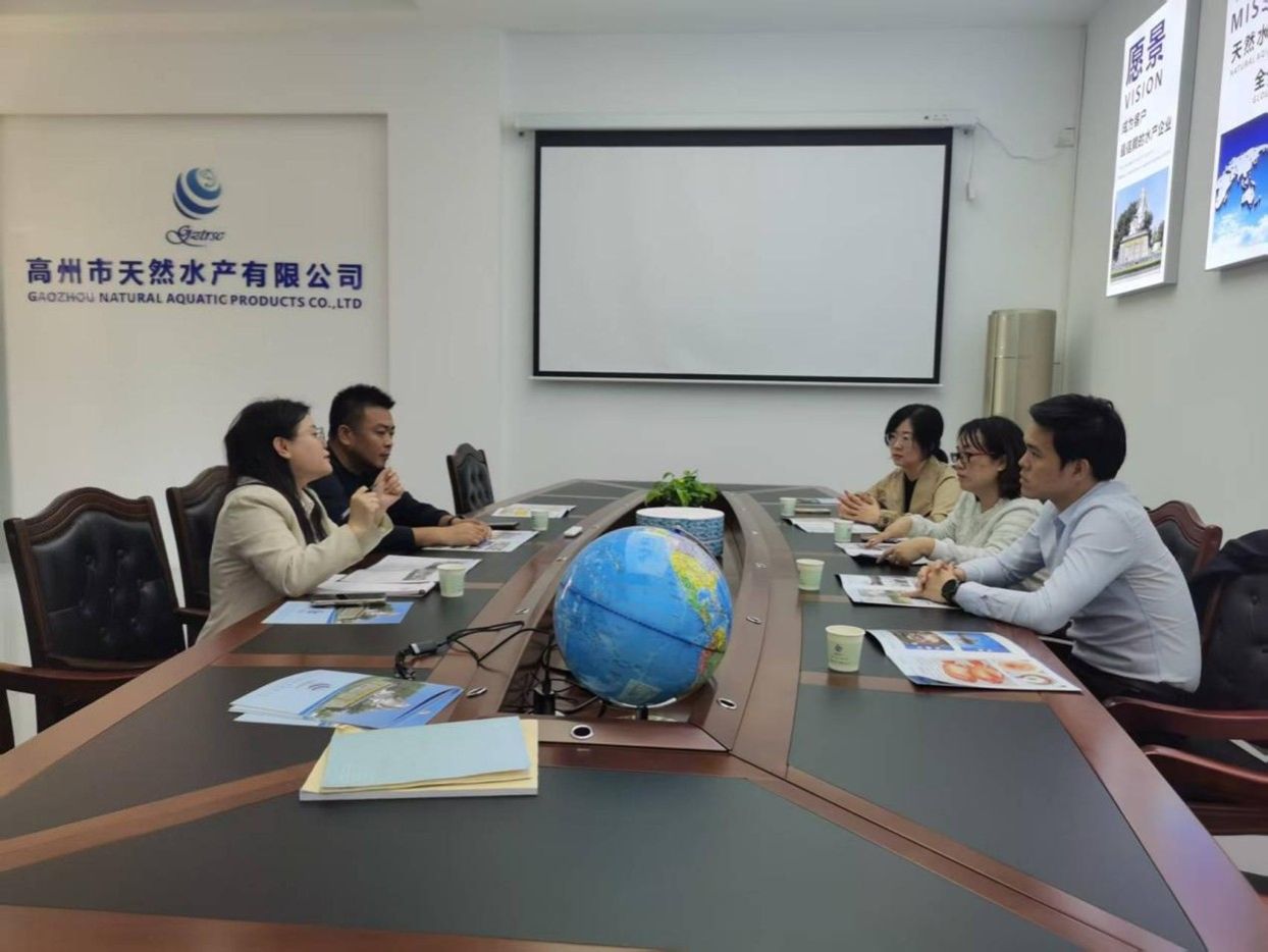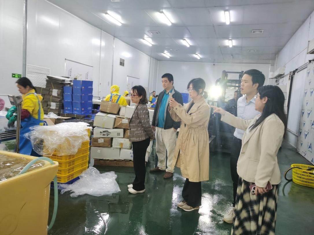 12月16日,在珠海驻石鼓镇帮扶工作队队长彭有带及队员莫况、杨苋萍的陪同下,专家组首站抵达高州市天然水产有限公司。公司副总经理严双连详细介绍了近两年的经营状况,她表示,公司外贸订单态势良好,主要市场为南非,并正积极拓展欧美市场。同时,公司已启动自有品牌“盼农鲜”的国内市场培育,搭建直播间尝试线上销售,但受限于冷藏仓储能力,国内市场的快速拓展面临现实挑战。