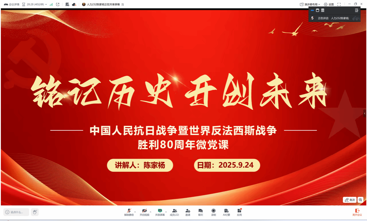 今年是中国人民抗日战争暨世界反法西斯战争胜利80周年,铭记抗战历史、传承伟大抗战精神,是激励党员砥砺前行的精神源泉;持续深化中央八项规定精神学习,更是筑牢党员纪律防线、永葆党的先进性的重要保障。为深入学习贯彻中央八项规定精神,将纪律作风建设与历史精神传承紧密结合,引导支部党员在缅怀先烈中坚定理想信念,在严守纪律中锤炼党性修养,人力资源管理专业学生党支部于9月24日线上开展“弘扬伟大抗战精神 勇毅奋进开创未来——纪念中国人民抗日战争暨世界反法西斯战争胜利80周年”专题学习暨中央八项规定精神学习教育总结会议,全体党员参加,支部书记陈舒恬主持。