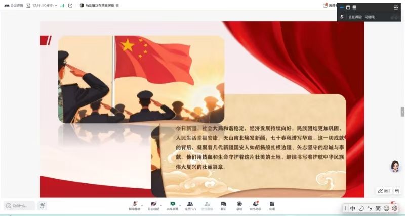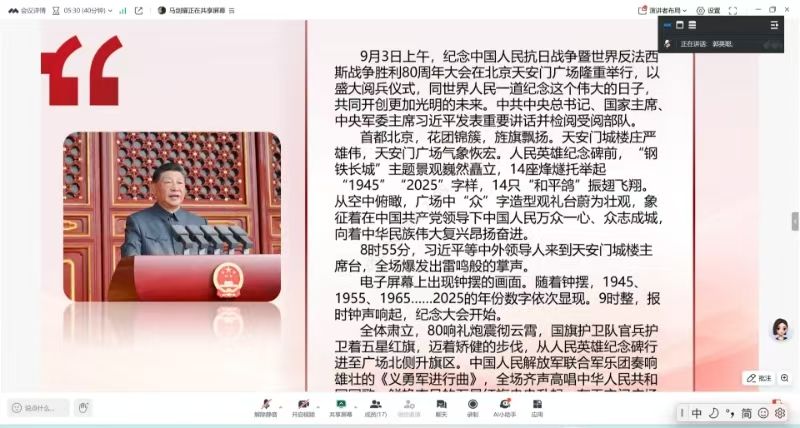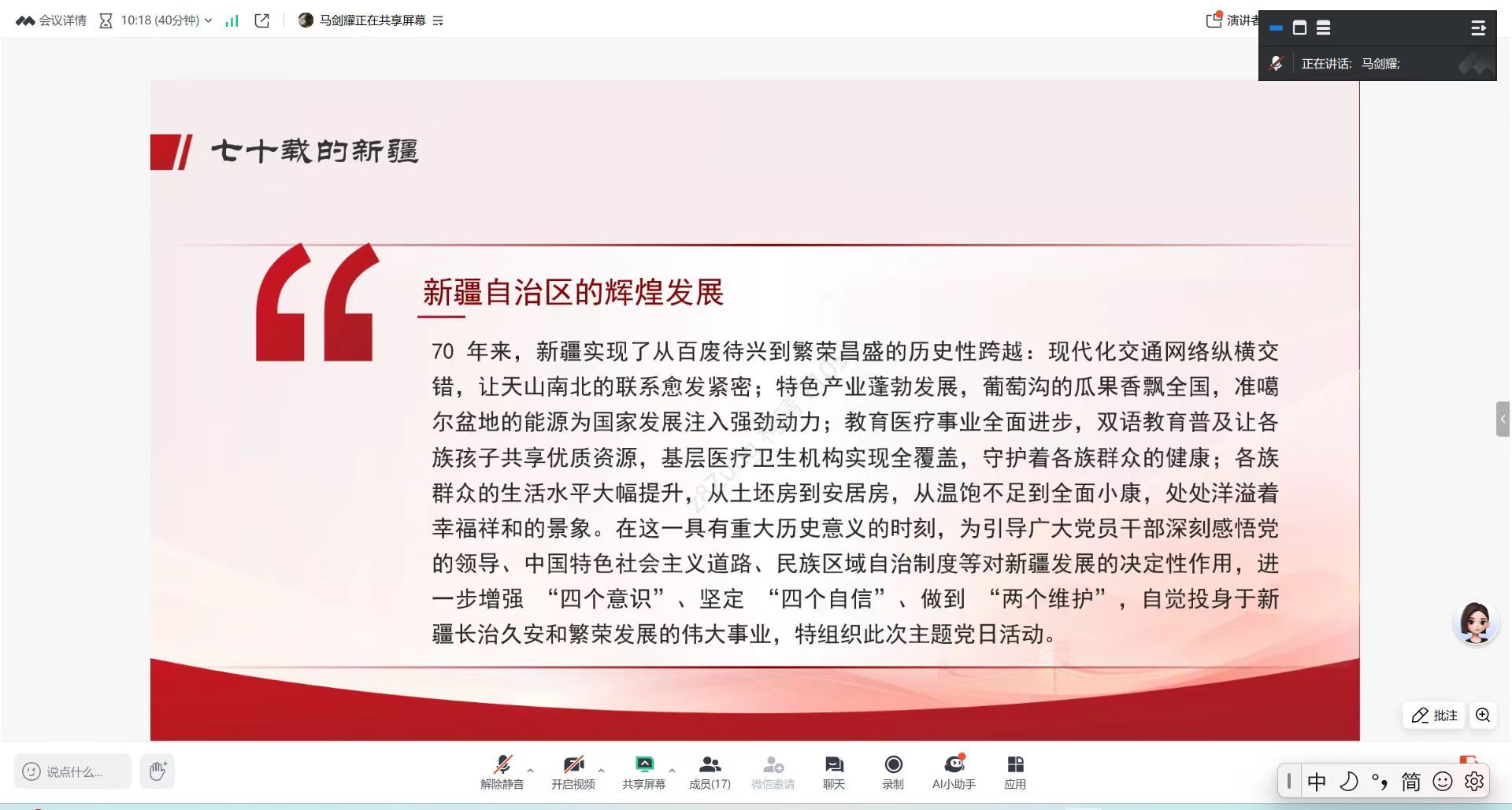 为传承红色基因、筑牢信仰之基,引导支部党员深刻体悟党的初心使命与历史必然,进一步增强历史自觉、坚定政治自觉,9月28日,市场营销专业学生党支部通过腾讯会议开展了“忆峥嵘抗战八十载,看新疆奋进七十年”主题党日活动。本次活动由支部书记郭英聪主持,全体党员积极参与。