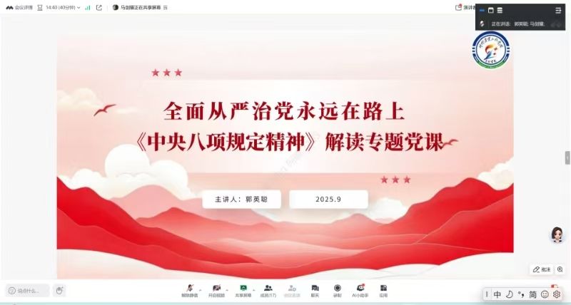 随后,郭英聪老师讲授了《中央八项规定精神》解读专题党课,带领大家全面深入的学习了八项规定的出台背景以及主要内容与意义,也强调了青年党员们要坚定理想信念,强化责任担当,在实践中磨练自己。全体党员同志们受益匪浅,也将会在今后的工作和生活中深入贯彻中央八项规定。