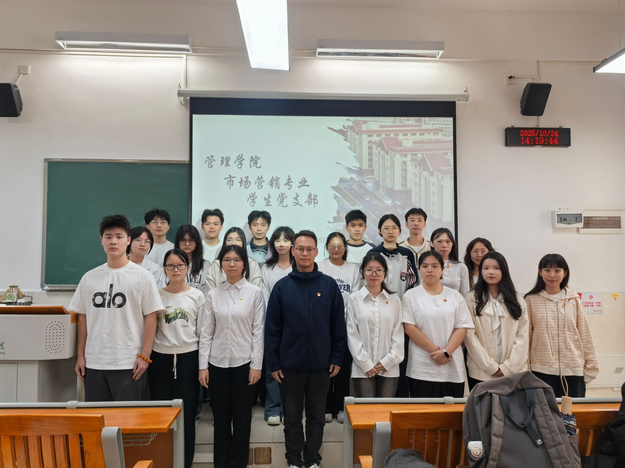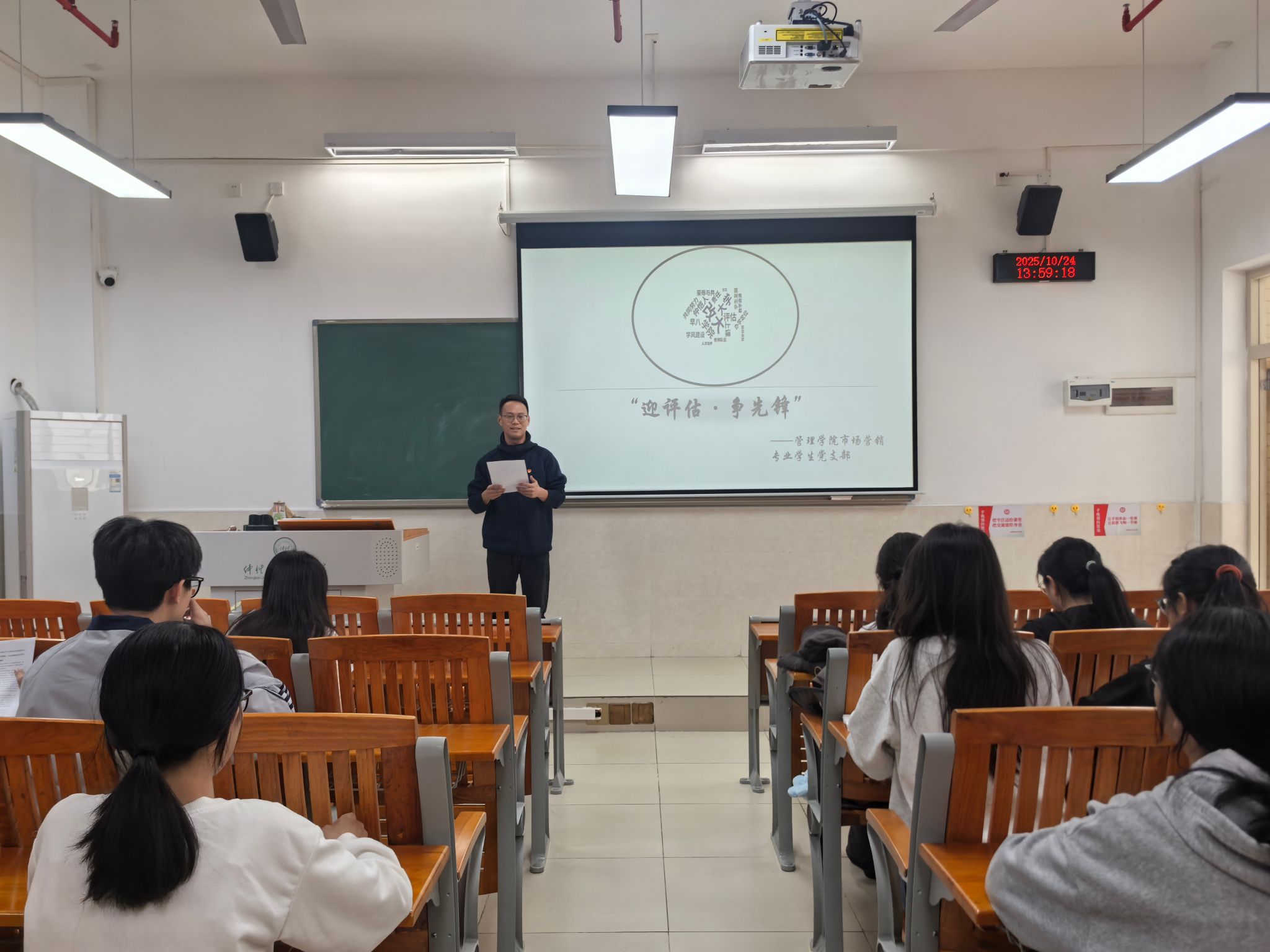 为深入学习贯彻习近平总书记关于全球治理系列倡议的重要精神,积极响应学校本科教育教学审核评估工作部署,充分发挥学生党支部战斗堡垒作用与党员先锋模范作用,2025 年 10 月 24 日,管理学院市场营销专业学生党支部开展 “迎评估・争先锋” 十月主题党日活动,以理论学习强思想、以实践行动促落实,为学校高质量通过本科教育教学审核评估凝聚青春力量。本次活动由支部书记郭英聪主持,全体党员积极参与。