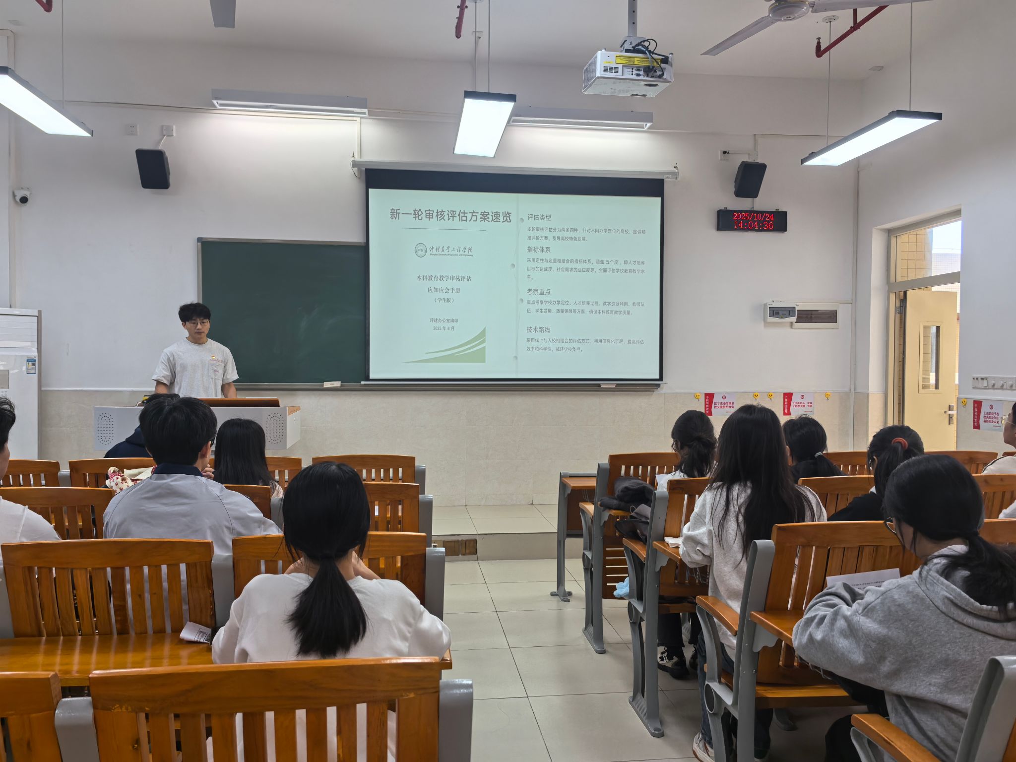 在 “迎接评估应知应会” 环节,马剑耀同学通过 PPT 演示、手册解读等形式,向党员全面讲解新一轮本科教育教学审核评估方案。同时,支部还重点提示课程目标达成度、教师教学投入、质量保障运行三大关键指标及风险点,并明确评估时间轴,让党员清晰掌握评估流程与关键节点。