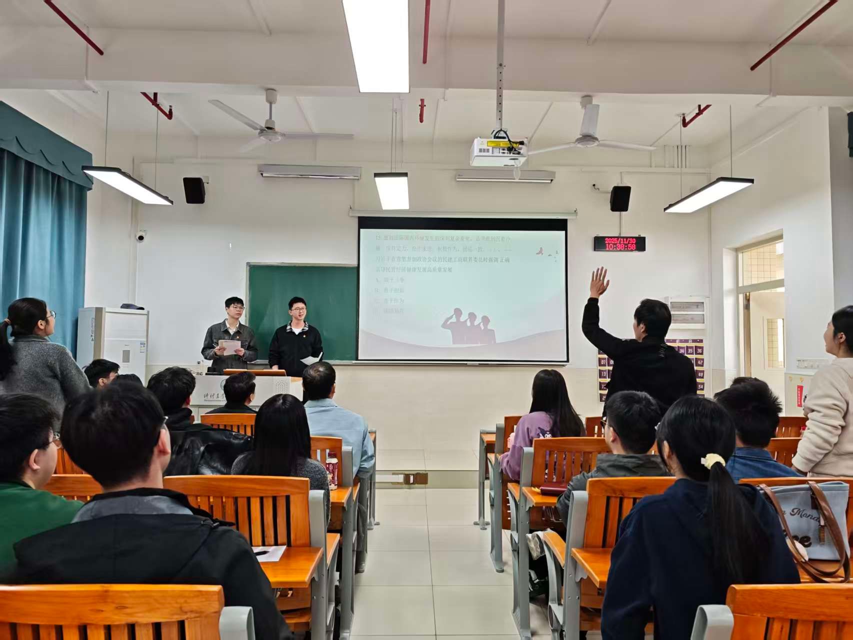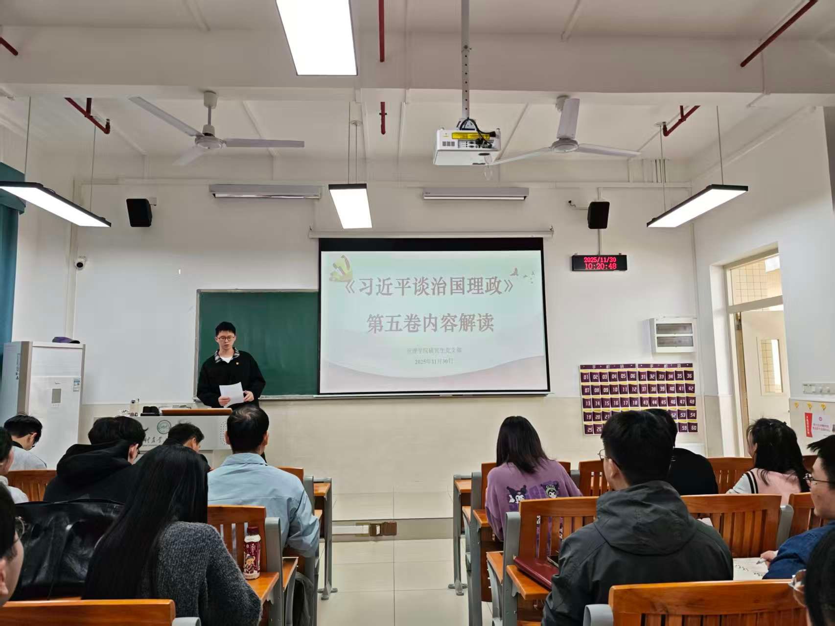 苏锡雄分享学习《习近平谈治国理政》第五卷心得体会,结合农业管理专业特点,鼓励支部同志立足国家需求,紧跟党和国家政策,既要有科研报国的信心,也要注重培养思维能力。为检验学习成效,活动设置了理论知识竞赛环节,各组选手默契配合、精准作答,并通过分享心得体会表达了对以赛促学的热情。紧接着,柯锦泉为知识竞赛优胜小组颁发奖品,并带领全体党员重温入党誓词,铿锵有力的誓言响彻全场。