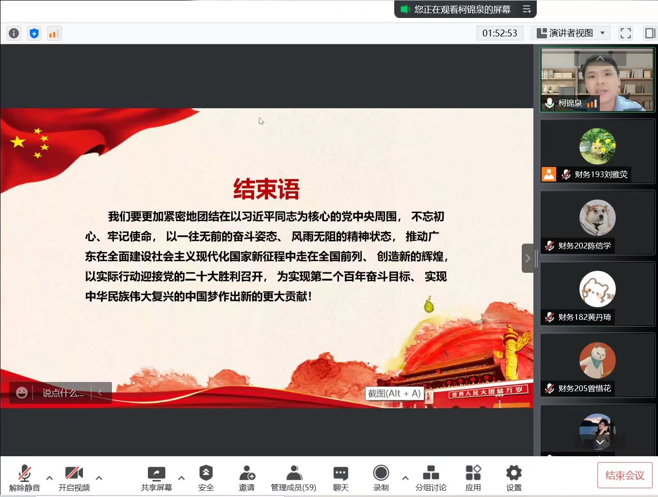 柯锦泉向全体党员介绍了广东省第十三次党代会的基本情况,紧接着重点围绕党代会公报全文内容进行详细解读。柯锦泉联系时事热点,从“过去五年广东省取得的新成就,今后五年全省的总体要求以及九项重点工作任务”这三个方面深入讲解。会上,他与党员同志们展开互动讨论,引发党员同志思考问题,并指出作为党员同志要发挥好先锋模范作用,推动各项工作迈上新台阶。最后,柯锦泉对2018级毕业生党员送出祝福,并表示,未毕业的党员同志应规划好自身未来,打造核心竞争力,提高创新能力。同时对支部全体党员提出三点要求:第一,要紧密团结以习近平同志为核心的党中央周围,砥砺奋进;第二,作为党员,要不忘初心,牢记使命;第三,要以实际行动迎接党的二十大胜利召开,为实现中国梦积极做出贡献。