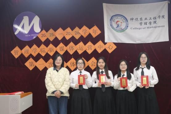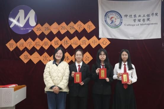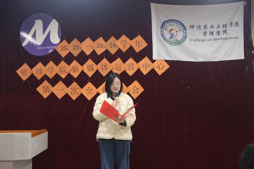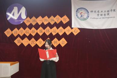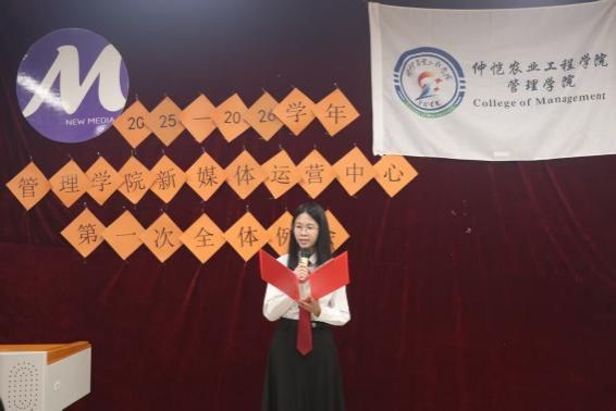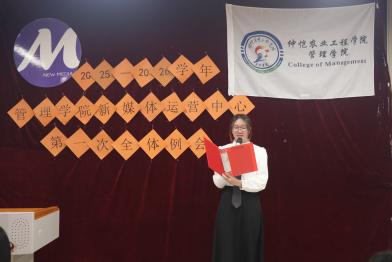 会议伊始,金晨晨宣读了2025-2026学年新媒体运营中心主任团和部长团名单,为他们颁发聘书并合影留念。