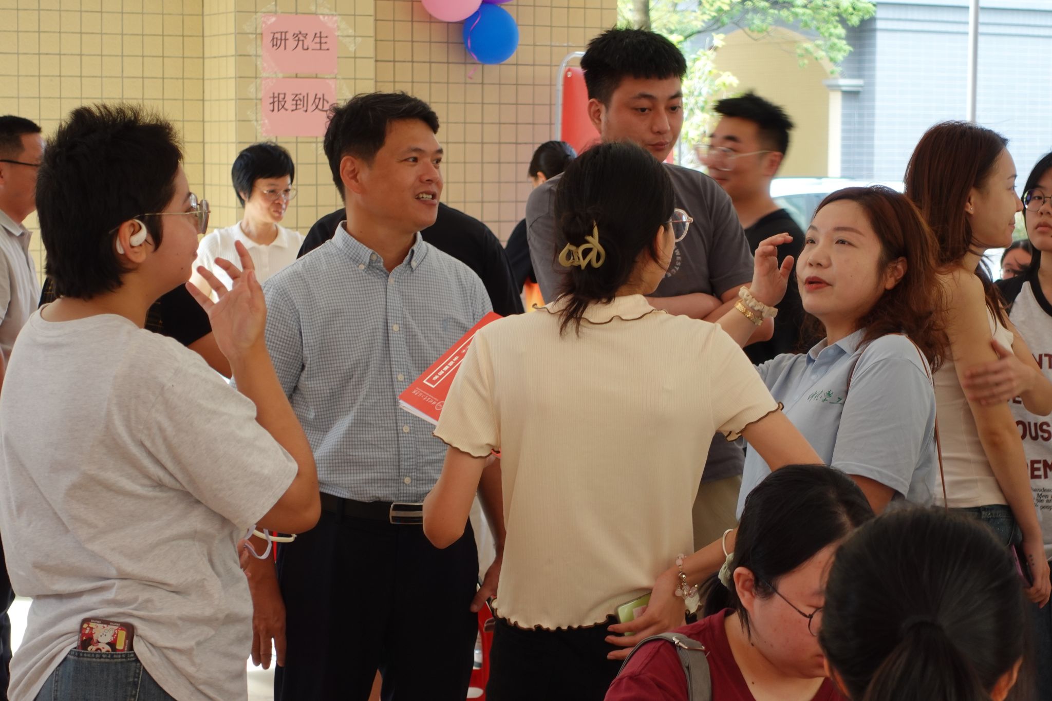 柯锦泉细致询问新生报到进度,并与新生及家长朋友们亲切交流。“从哪里来?”“对学校印象如何?”“有没有需要帮助的地方?”一句句温暖的问候,传递着学院深深的牵挂。郭肖明特地向远道而来的学生家长表示慰问和感谢,耐心倾听他们的反馈,并嘱咐学院要全力做好服务,让家长放心、学生安心。