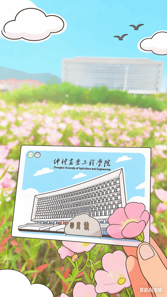 明信片4:白云校区图书馆|书山藏智楼宇巍,飞鸽绕云向天飞,刻石上的篆字诉说着文化的传承,是仲恺学子汲取知识、沉淀自我的精神殿堂。