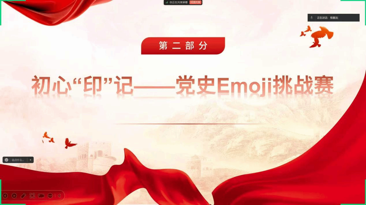 紧接着,为让党史学习走深走实、寓学于乐,支部精心开展“初心‘印’记——党史问答挑战赛”线上互动活动。游戏以建党伟业、长征胜利、改革开放、脱贫攻坚等党的重大历史事件为核心,通过弹幕答题的形式展开比拼。活动中,支部成员踊跃参与、积极抢答,在紧张有趣的互动中重温党的百年奋斗历程,加深了对党史重大事件历史意义的理解,让红色基因入血脉,让初心使命扎根心底。