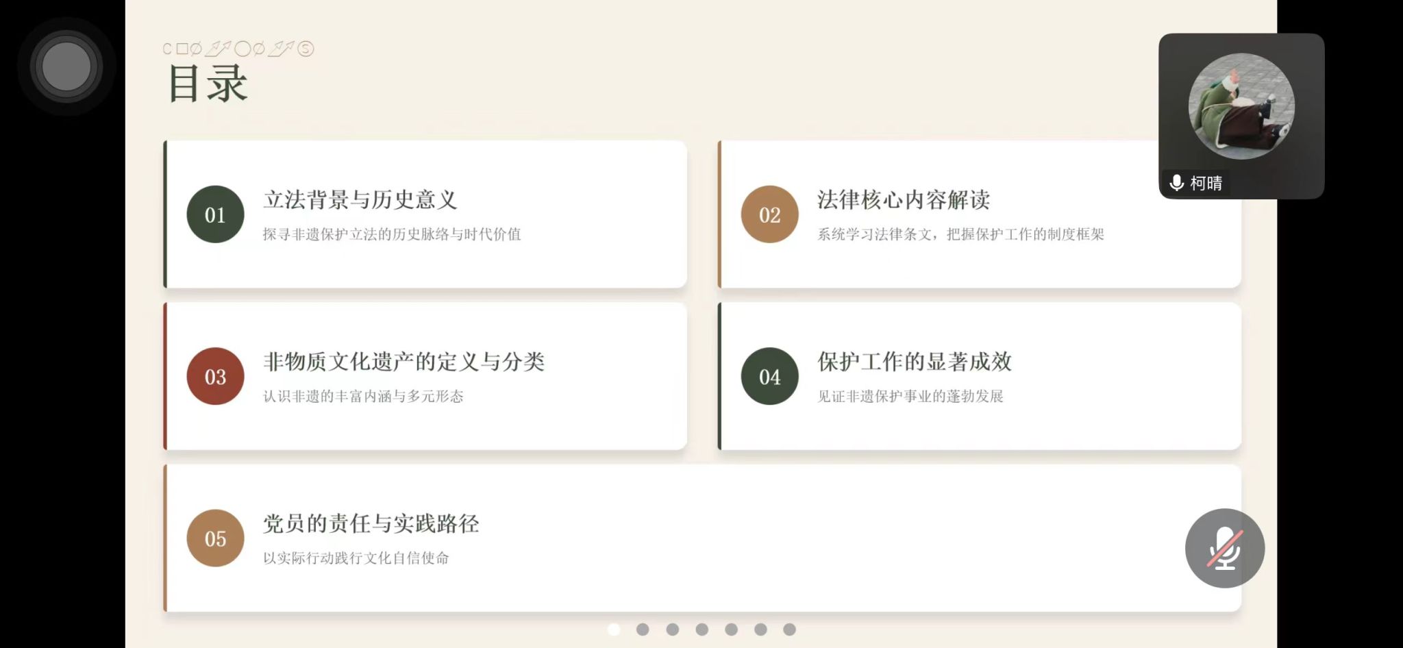 在专题学习环节,党支部围绕“非遗保护立法”展开系统学习。从立法背景与历史意义、法律核心内容、非遗定义与分类、保护工作显著成效以及党员的责任与实践路径五个方面进行学习。大家进一步学习了非遗保护的法律框架和制度要求,认识到法治是守护文化根脉的根本保障、非遗传承同样需要科技支撑。同时,作为学生党员,可以主动学习新技术、新理念,探索“科技+非遗”的融合发展路径,争做文化自信的践行者和创新者。