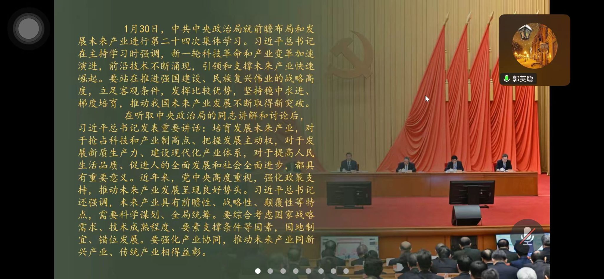 活动伊始,郭英聪老师领学第一议题,提到学习1月30日中共中央政治局就前瞻布局和发展未来产业进行第二十四次集体学习时习近平总书记的重要讲话精神。总书记强调,新一轮科技革命和产业变革加速演进,要充分发挥新型举国体制优势,加大关键核心技术攻关力度,推动创新资源向企业集聚。党员们深刻认识到,科技创新不仅引领未来产业发展,也为非遗保护提供了新思路、新工具,必须将科技赋能与文化传承紧密结合。