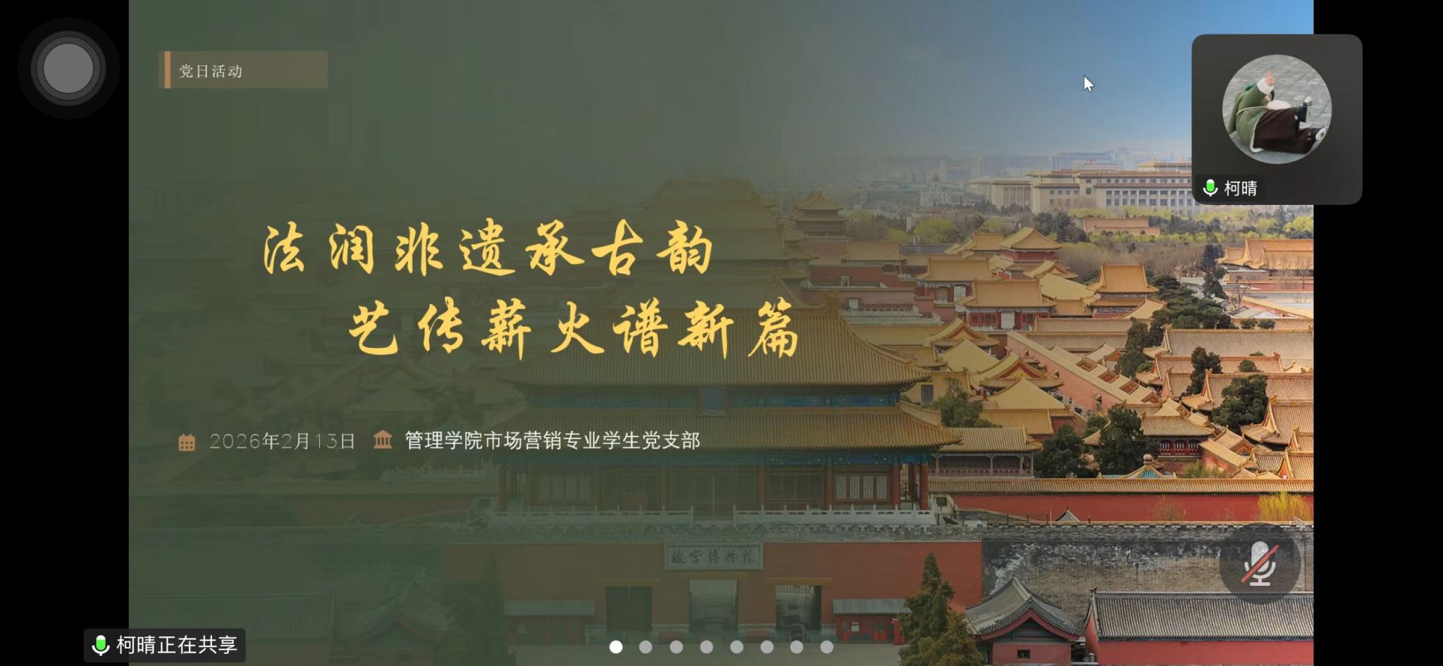 为深入学习贯彻习近平总书记近期关于未来产业与科技创新的重要讲话精神,推动法治精神与非遗保护深度融合,2026年2月13日,管理学院市场营销专业学生党支部开展“法润非遗承古韵,艺传薪火谱新篇”主题党日活动。本次活动由党支部书记郭英聪老师主持,全体党员参与。